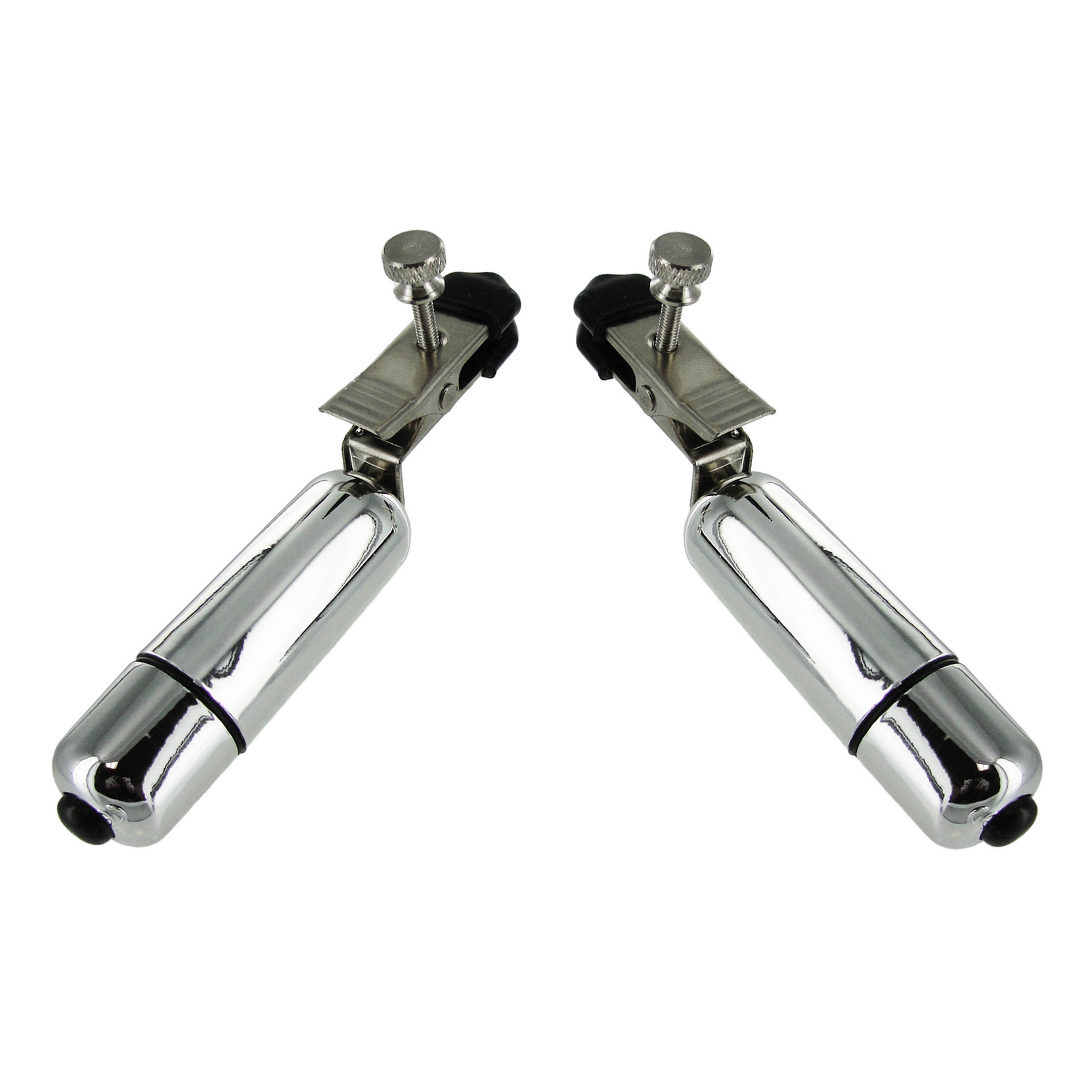 Finally, a powerful one touch vibrating wireless sex toy. These silver babies will shake practically anything you attach the clamps to. Easy to use, just unscrew the egg to remove the battery seal then apply the cover. Now just press the little black button. The rubber coated clamps are adjustable to achieve the desired pressure. Can also be a lot of fun attached to the scrotum, penis, labia and other very sensitive areas of the body